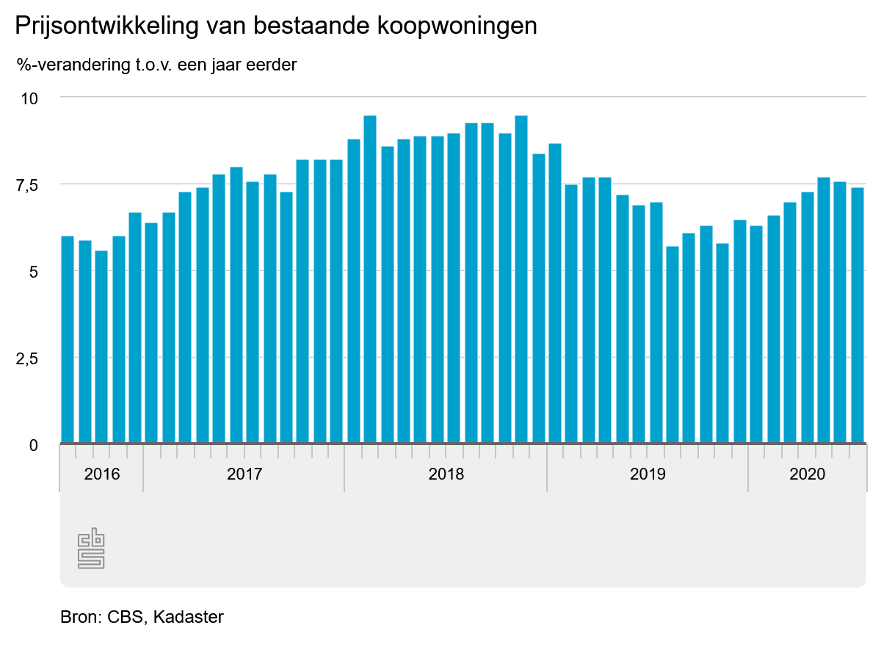 Het gemiddelde bedrag waarvoor een woning van eigenaar wisselt, is in vergelijking tot 2013 gestegen met 45% toen gemiddeld 213 duizend euro voor een woning werd betaald. De ontwikkeling van 2019 heeft zich voortgezet in het eerste kwartaal van 2020. De gemiddelde koopsom van de geregistreerde verkochte woningen ligt in het eerste kwartaal van 2020 op 326 duizend euro, wat 7,8% meer is vergeleken met dezelfde periode vorig jaar. De cijfers van het CBS bevestigen deze trend en geven aan dat de prijsontwikkeling van bestaande koopwoningen jaar op jaar gestegen is. De afgelopen vier jaar zijn de huizenprijzen gemiddeld tussen de 6% en 9% gestegen.
