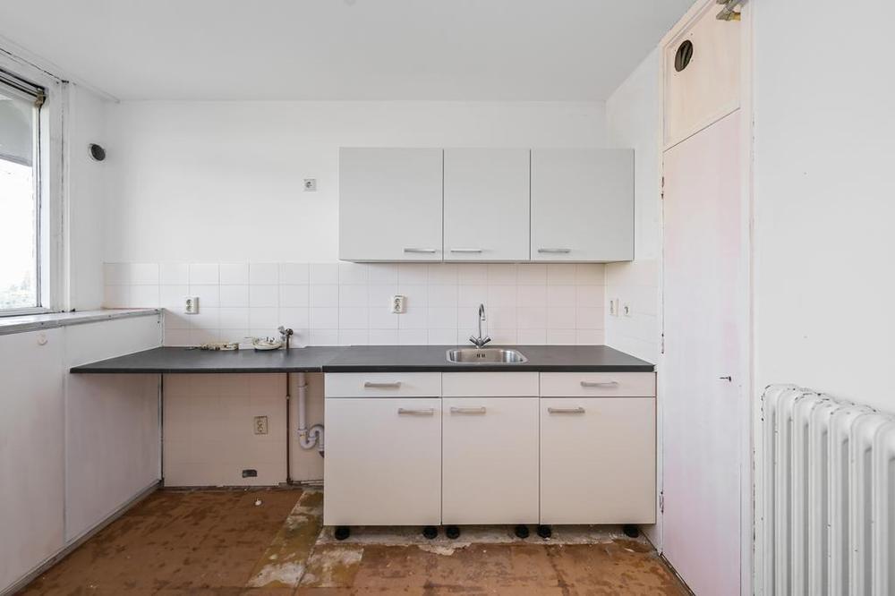 Bij aankomst in de gemeenschappelijke hal van het gebouw neemt u de lift naar de 6e verdieping, waar u de ingang van dit prachtige hoekappartement vindt. Bij binnenkomst in de hal van het appartement bevindt de keuken zich direct aan uw linkerhand, een lichte ruimte die uitnodigt tot culinaire creativiteit. Naast de keuken ligt een handige bergruimte met de CV-ketel (Intergas Kombi Kompakt HRE 24/18 A uit 2019) en ruimte voor opslag.