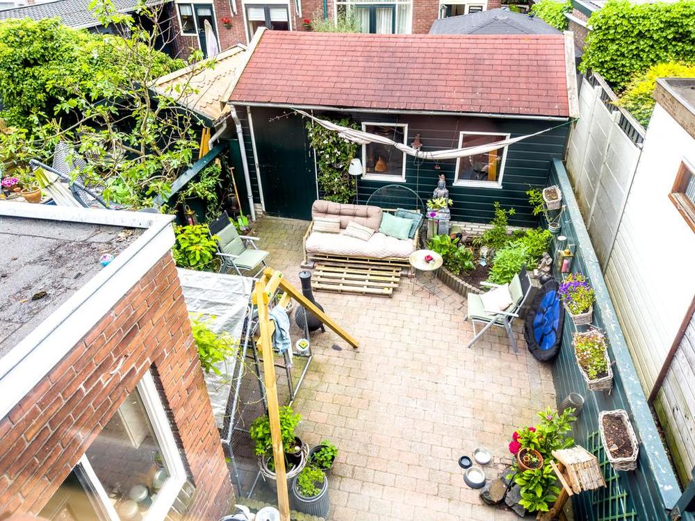 De achtertuin is voorzien van tegels en meerdere groenplekken. Aan het eind van de achtertuin staat een grote houten schuur. Altijd handig voor de klusspullen of ideaal om te verbouwen naar een aparte woonruimte. De tuin is gelegen op het westen, dus gegarandeerd zon!
