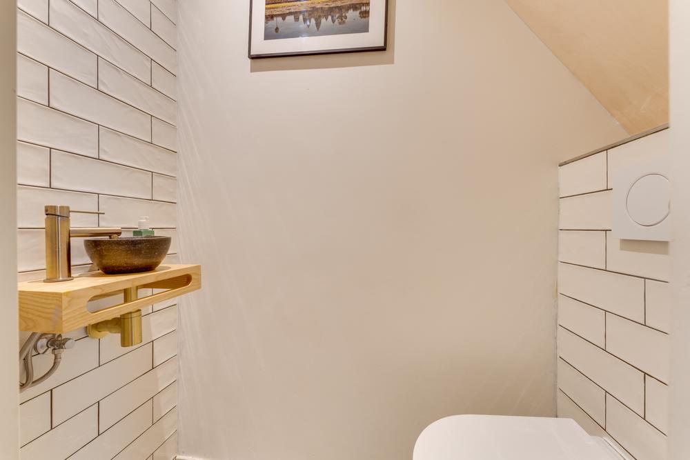 Entrance with hall, staircase and modern toilet. Spacious, bright living room with open kitchen in the middle and generous extension at the rear. Thanks to the large windows and French doors to the garden you enjoy plenty of daylight here. The kitchen is modern and equipped with all appliances.