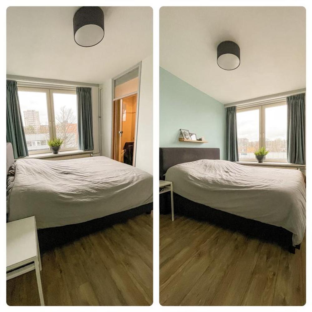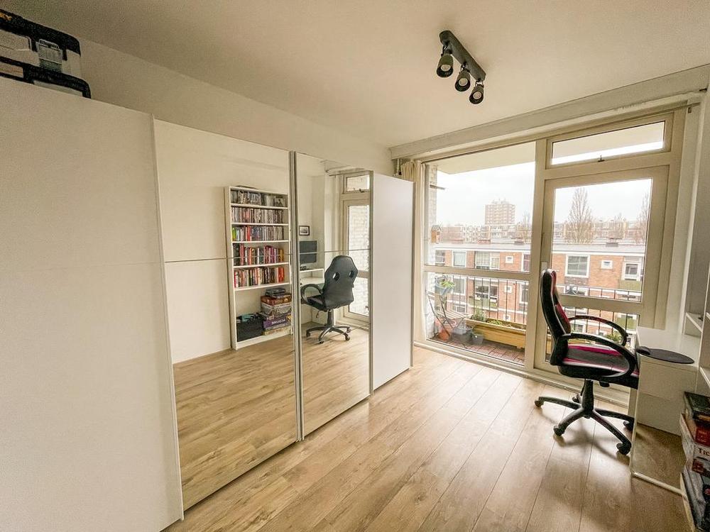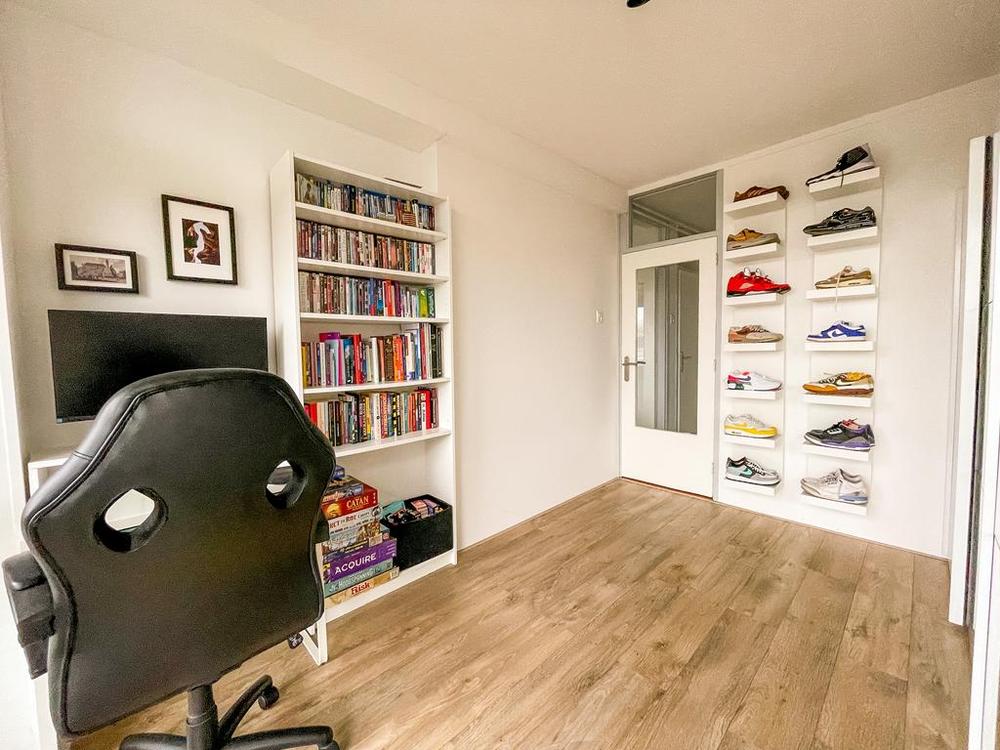 Wanneer je links van de hal loopt, bereik je de eerste slaapkamer die momenteel is ingericht als kantoor- en opslagruimte. Vanuit deze slaapkamer heb je toegang tot het balkon op het zuiden. Met een oppervlakte van 10 vierkante meter is er genoeg ruimte voor een tweepersoonsbed.