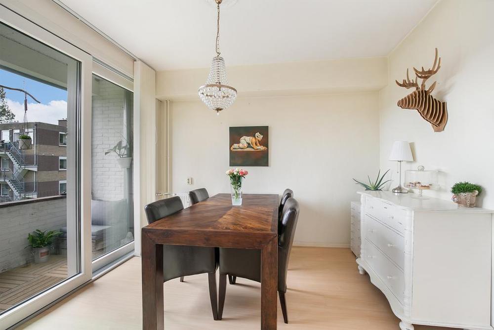 De vroegere derde slaapkamer is getransformeerd tot een charmante eetkamer, die naadloos overloopt in de woonkamer, wat zorgt voor een prachtig open en ruimtelijk gevoel. Het balkon op het zuiden is toegankelijk via een recent geïnstalleerde schuifpui. Samen met het vernieuwde raam ernaast zorgt het voor veel lichtinval in de woning.
