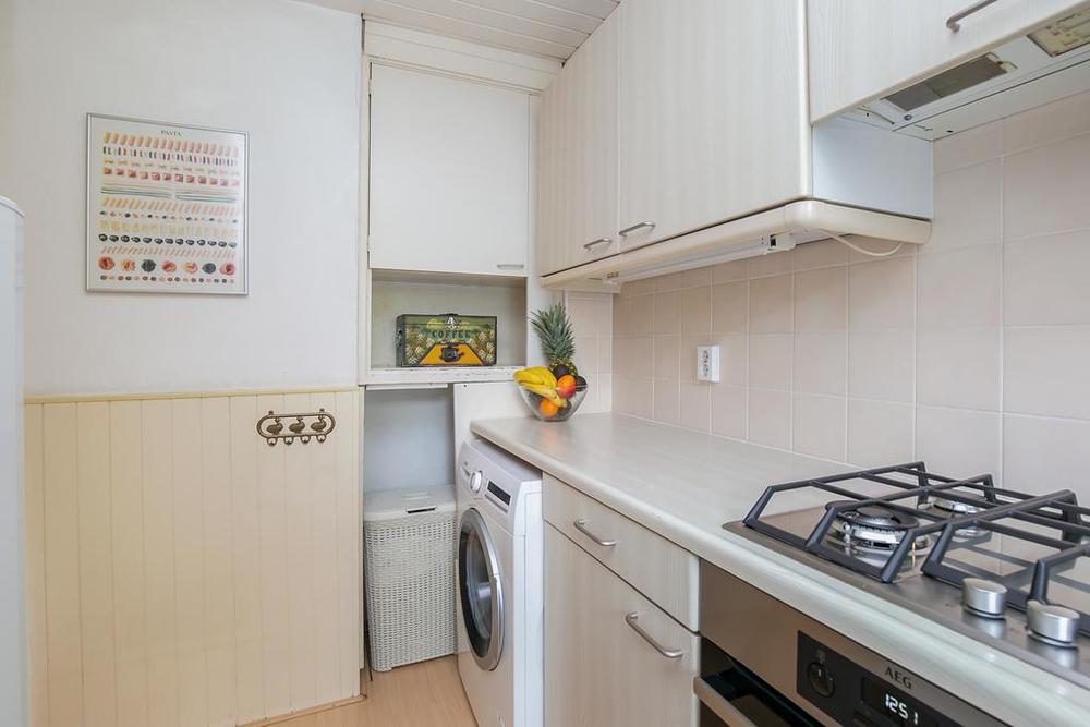 Deze centrale hal verbindt elke ruimte in het appartement. Rechts van de hal bevindt zich de moderne keuken. Met voorzieningen zoals een oven, gasfornuis met afzuigkap en een speciale ruimte voor de wasmachine biedt deze keuken alles wat een hedendaagse chef-kok zou verlangen. De geiser zorgt voor continu warm water naar zowel de keuken als de badkamer. En met voldoende kastruimte blijft jouw keuken altijd geordend.