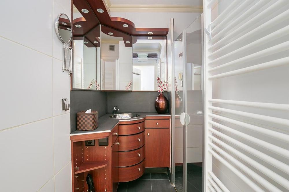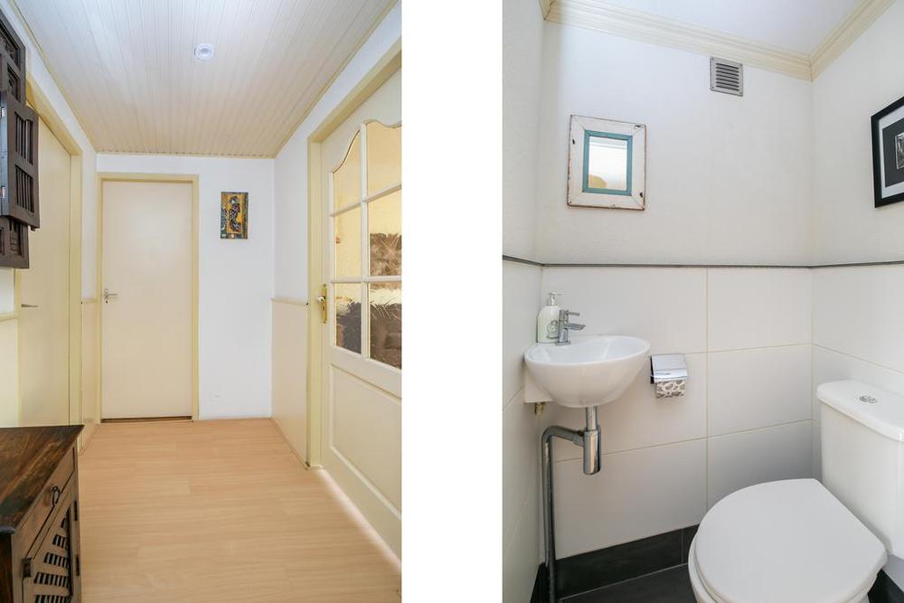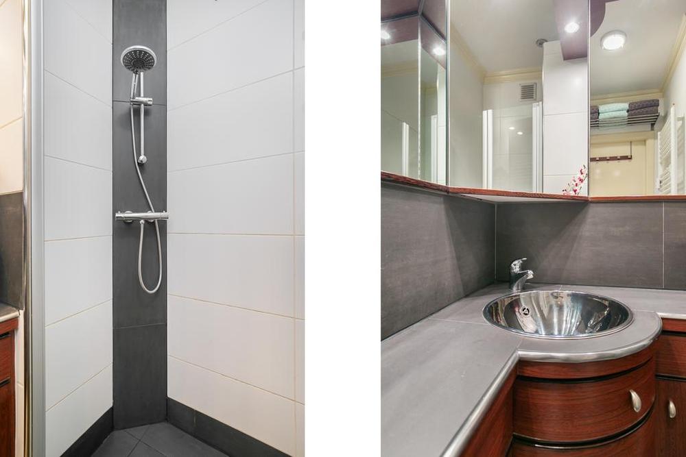 Via de hal is een apart toilet bereikbaar naast de badkamer. Hoewel deze compact is, heeft het een efficiënte indeling met een ruime douche en wastafel. De designradiator zorgt niet alleen voor warmte maar biedt ook voldoende ruimte voor uw handdoeken.