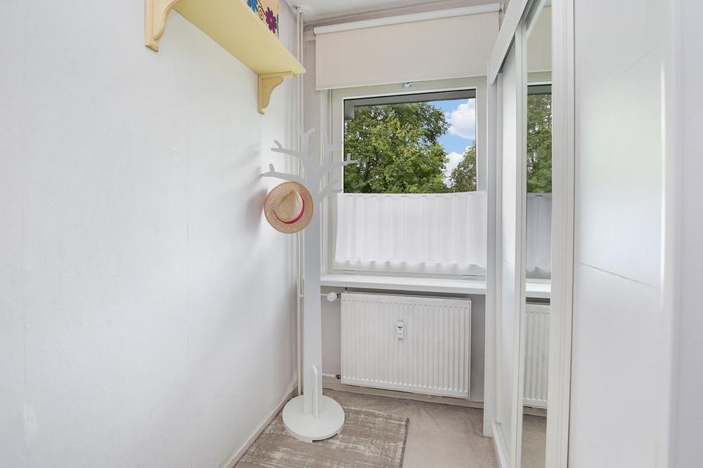 De hal leidt verder naar twee slaapkamers. De eerste, momenteel in gebruik als kastenkamer, kan eenvoudig worden omgevormd tot een tweede slaapkamer of werkkamer. De hoofdslaapkamer, beschikt over inbouwkasten die een zee van opbergruimte bieden.