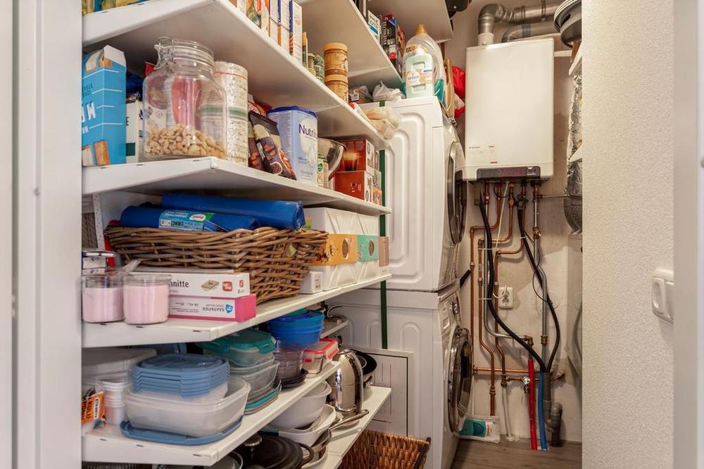 Second floor: Spacious terrace which gives the feeling of a private garden; entrance hall with meter cupboard; toilet with hand basin; bathroom with washbasin and shower corner; 2 bedrooms; living room with balcony at the front of the house; open kitchen with appliances including 5-burner stove (gas on glass), extractor, microwave, dishwasher, refrigerator and separate freezer; storage room with washer and dryer connections, mechanical ventilation unit, heat recovery system and central heating system.