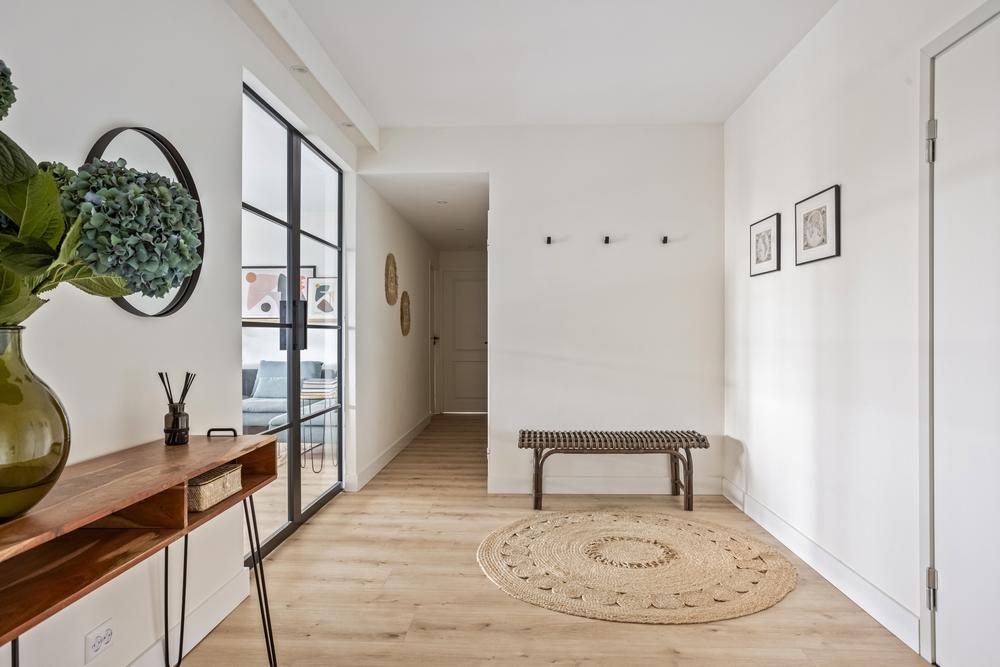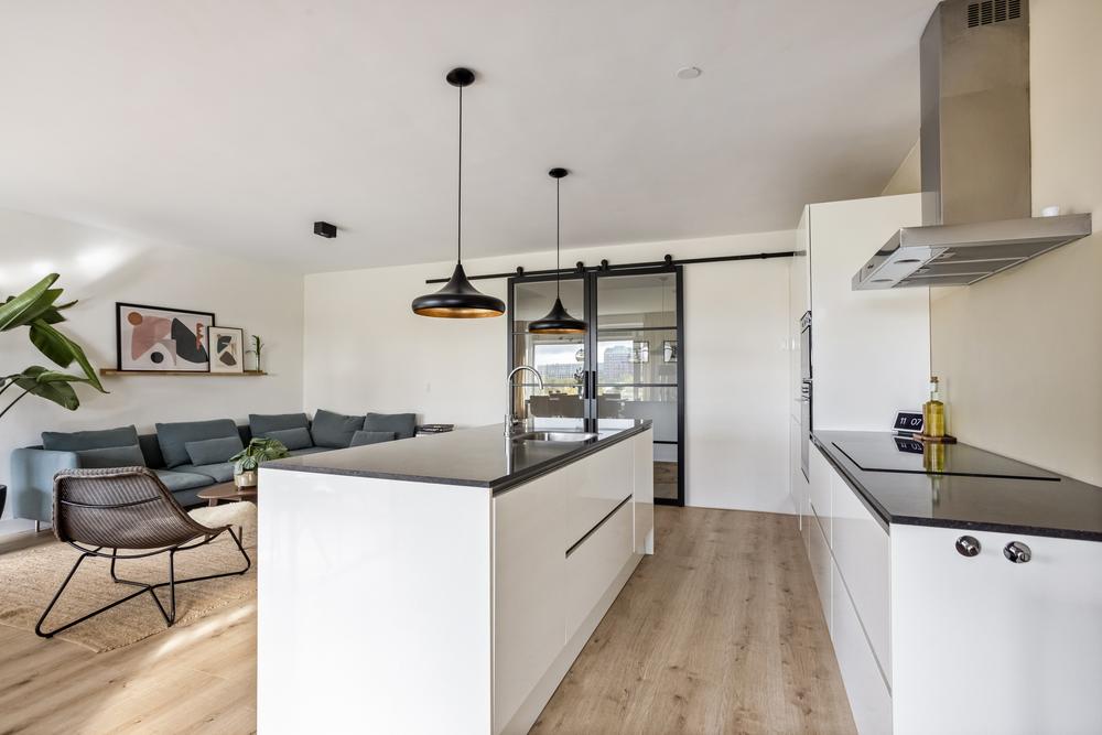 You enter into a surprisingly spacious hallway with stylish finishes and ample built-in closet space. The light, sleek stucco work and recessed spotlights immediately give a calm and modern atmosphere. Through beautiful sliding doors you enter the spacious living room with open kitchen - a wonderful place to cook, drink and relax. The updated kitchen features built-in appliances, induction cooking, a generous sink island with bar function and sleek countertop.