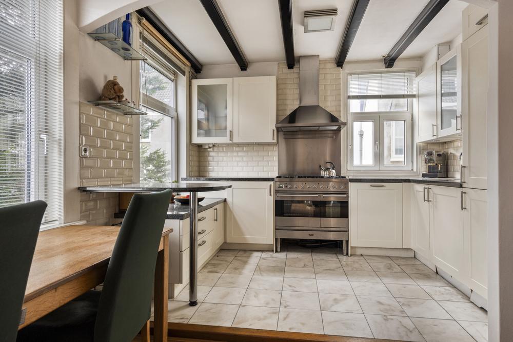 The open kitchen is both practical and stylish, fitted with sleek white cabinetry, a generous gas stove with oven, and plenty of counter space. The combination of wooden floors and a raised tiled section gives the room a playful yet homely vibe.