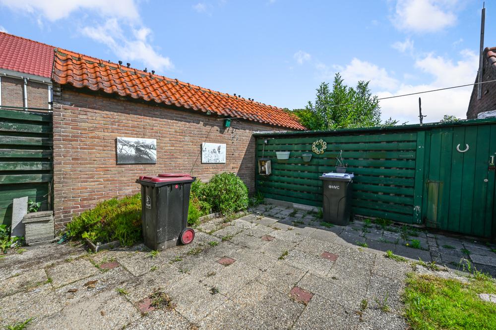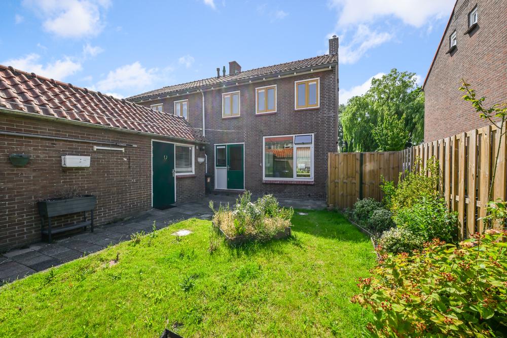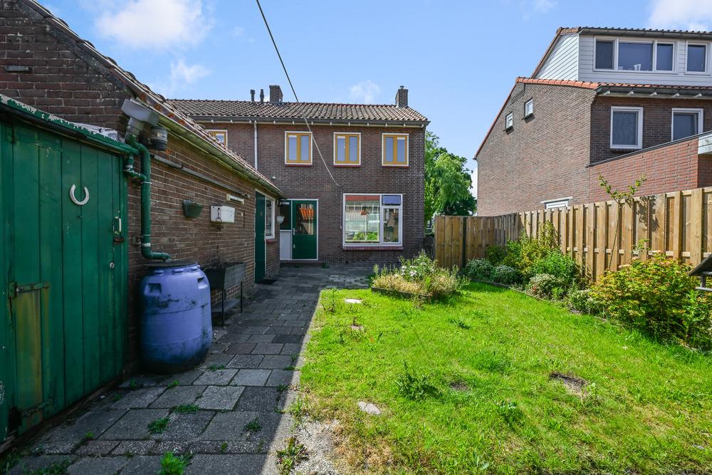 De achtertuin is erg diep en breed, wat veel ruimte biedt voor de zon. Hier vind je ook de stenen berging, ideaal voor fietsen, gereedschap of tuinspullen.
