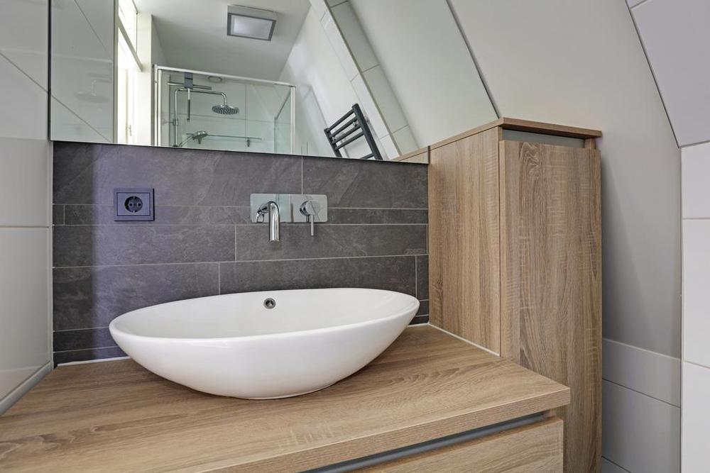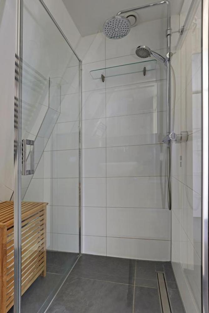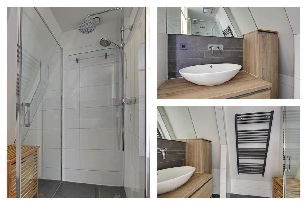 Via de trap in de hal bereiken we de overloop van de eerste verdieping. Hier bevinden zich 2 slaapkamers, een apart washok en de badkamer. De complete badkamer is uitgevoerd met een wastafel, een design radiator en een inloopdouche met regenshower.