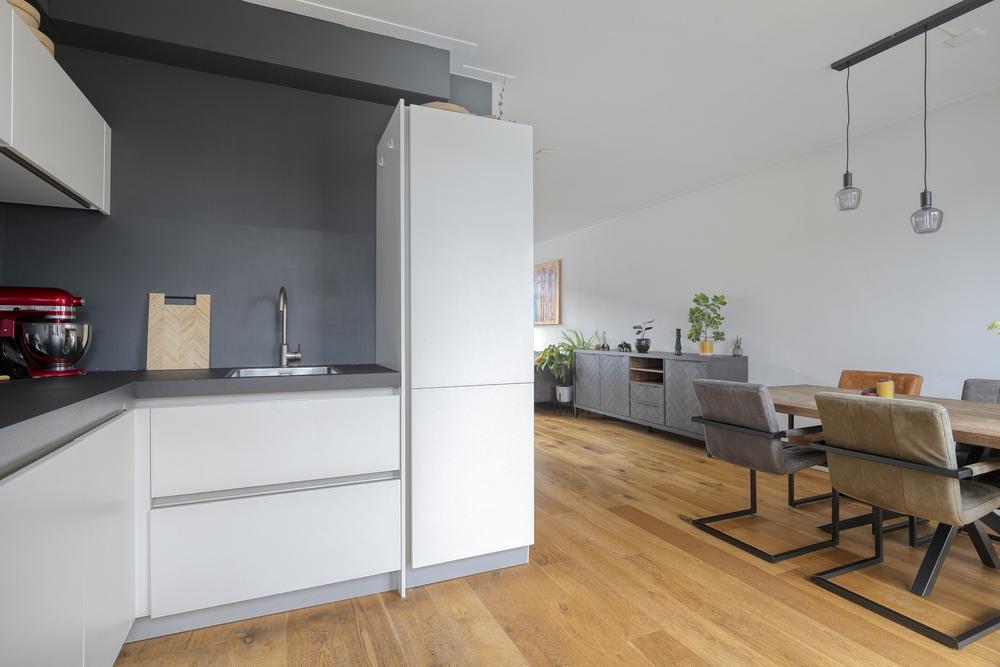 Lichte, sfeervolle woonkamer met grote raampartijen aan de voorzijde en een prachtige houten vloer die direct warmte en karakter geeft. De moderne open keuken is voorzien van inbouwapparatuur en grenst aan het brede balkon op de achterzijde — perfect voor een zomerse borrel of ochtendkoffie. Dit balkon is in 2013 verlengd. Daarnaast is er op deze verdieping een separaat toilet met fontein aanwezig.