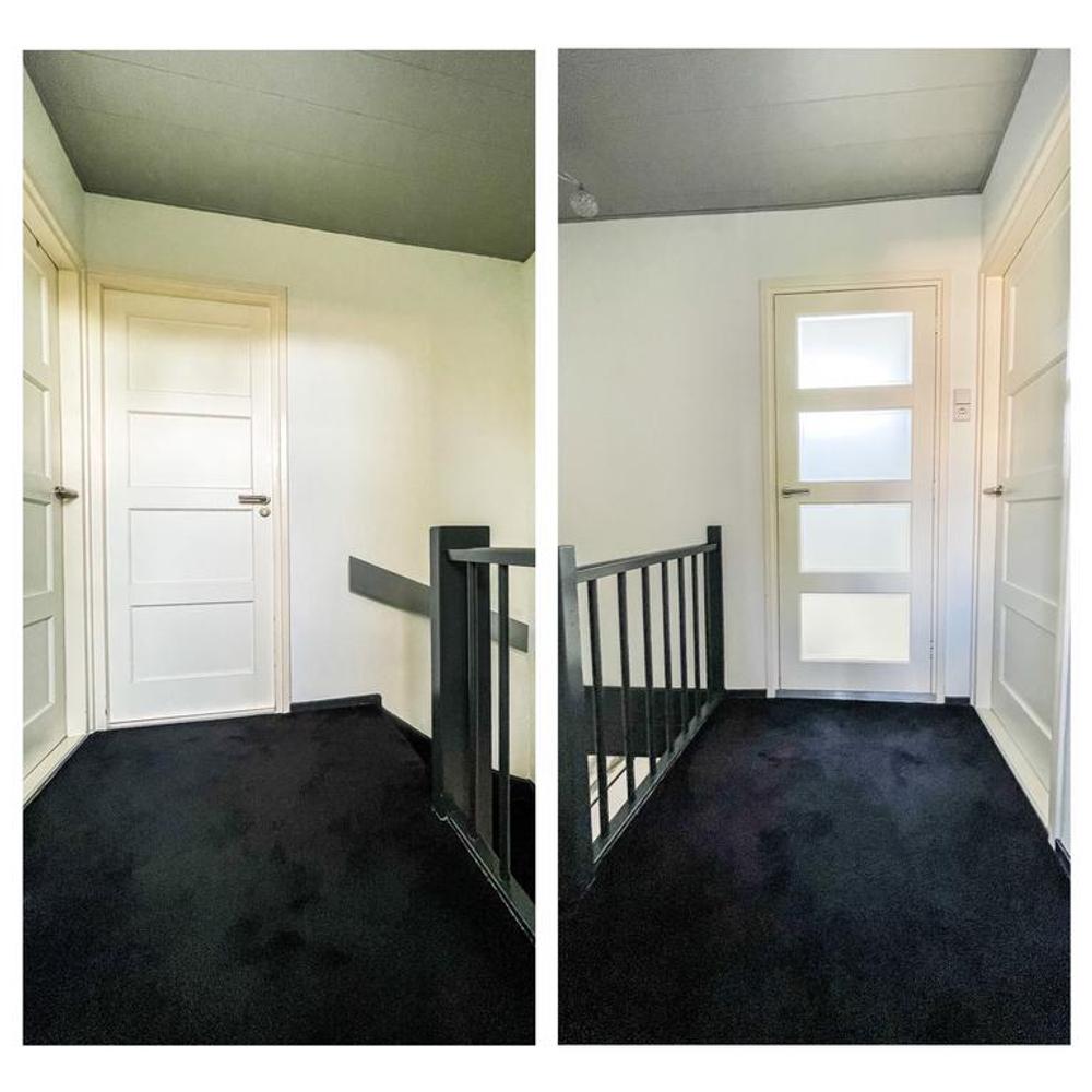 Achter de voordeur bevindt zich de entreehal met toilet en fonteintje, de meterkast, de trap naar de eerste verdieping en de toegang tot de woonkamer.