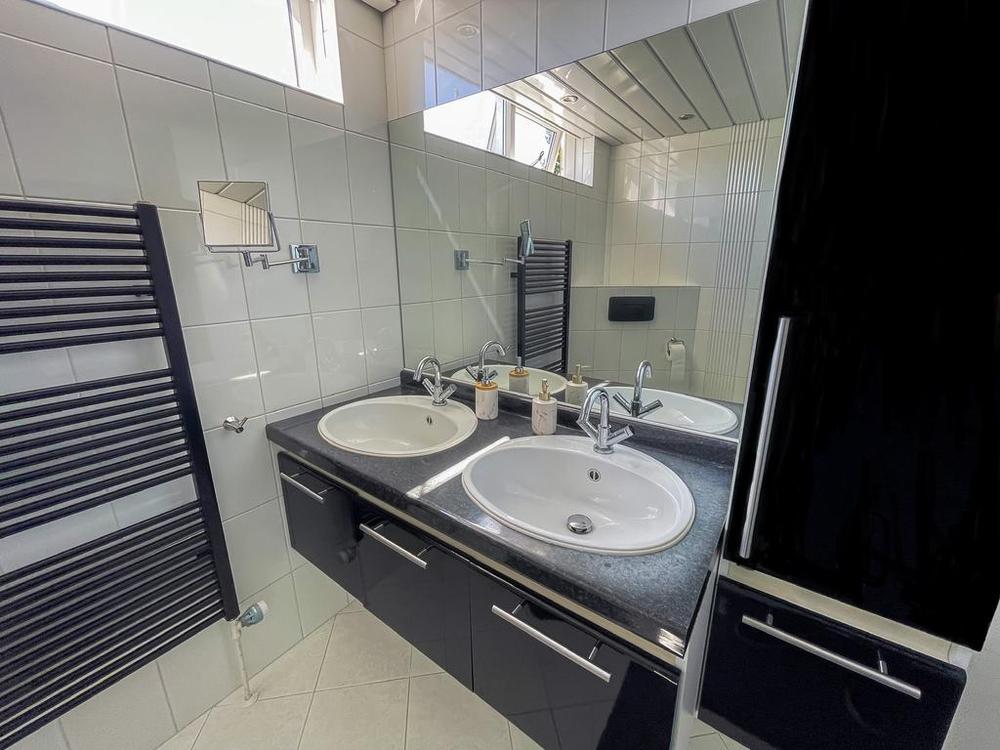 Op de bovenverdieping van de woning bevinden zich drie slaapkamers en een badkamer. De badkamer is voorzien van een douche met thermostatische kraan, dubbele wastafel met veel opbergruimte en toilet.